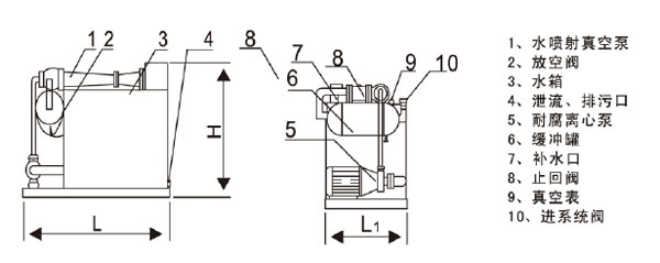 1、蒸汽真空泵 2、水噴射真空閥 3、放空閥 4、水箱 5、泄流、排污口 6、耐腐離心泵 7、緩沖罐 8、補水口 9、系統(tǒng)連接閥
